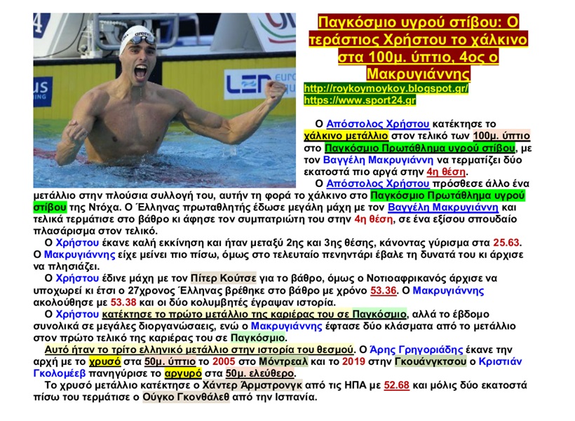 Παγκόσμιο υγρού στίβου: Ο τεράστιος Χρήστου το χάλκινο στα 100μ. ύπτιο, 4ος ο Μακρυγιάννης